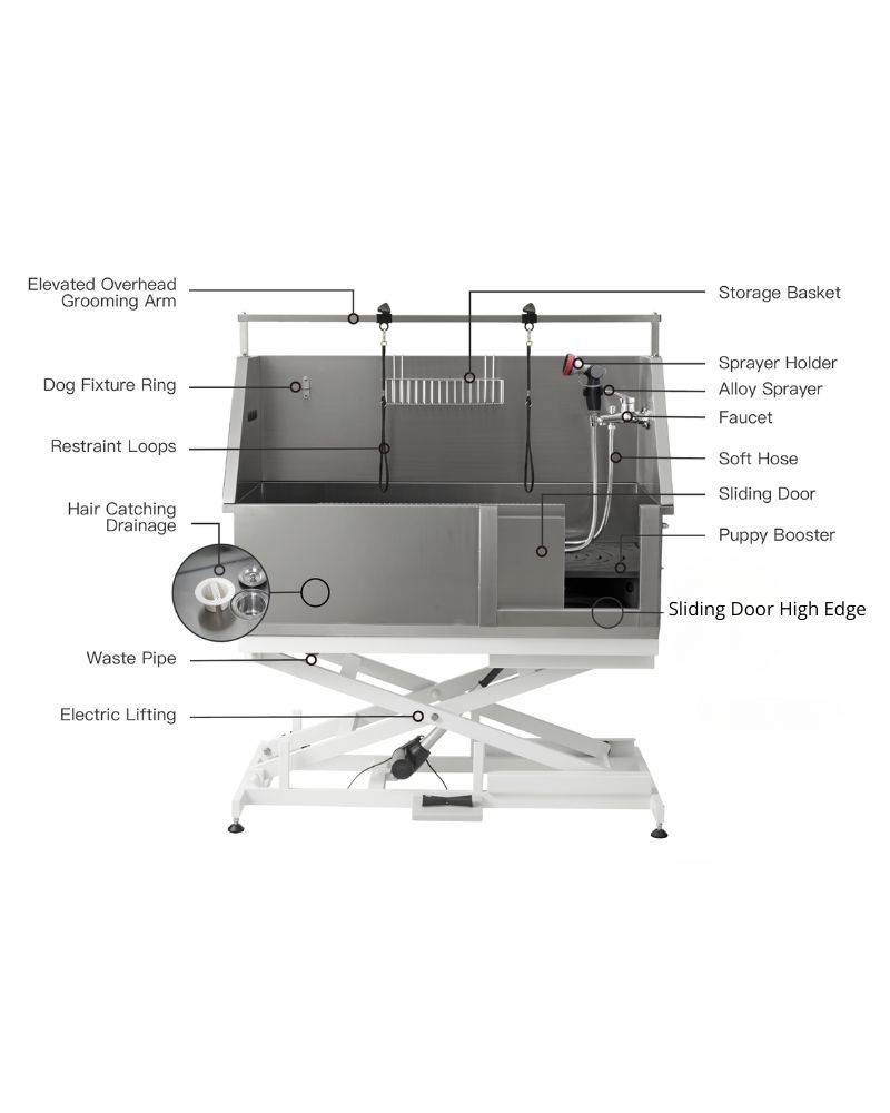Stainless Steel Electric Lift Bath complete with bonus tapware, spray nozzle & shampoo rack and for a limited time an additional saving you up to $250.00 making this professional stainless steel electric lift bath is a comprehensive bathing option with all the features & accessories provided as it is a made out of grade heavy duty 1.2mm gauge 304 stainless steel for professional grooming use & durability & strength for even the largest dogs with pre drilled holes for the tap-ware for either a 4″ or 6″ faucet and quick installation (giving you the option of having your taps on either side of the Bath) also this bath has the features of a sliding door ,hair catching drainage with waste pipes, removable wire storage basket, full tap-ware with adjustable shower head of 9 x different spray options & all the hoses required for this bath and it also has an elevated overhead grooming arm with 2 x adjustable loops a dog fixture ring for any additional bath loops you may require to use & a removable puppy booster(ideal for the smaller dog breeds) & with the touch of your foot to control the bath pedals for varying heights enabling you to be hands free making it easier to manage the animal