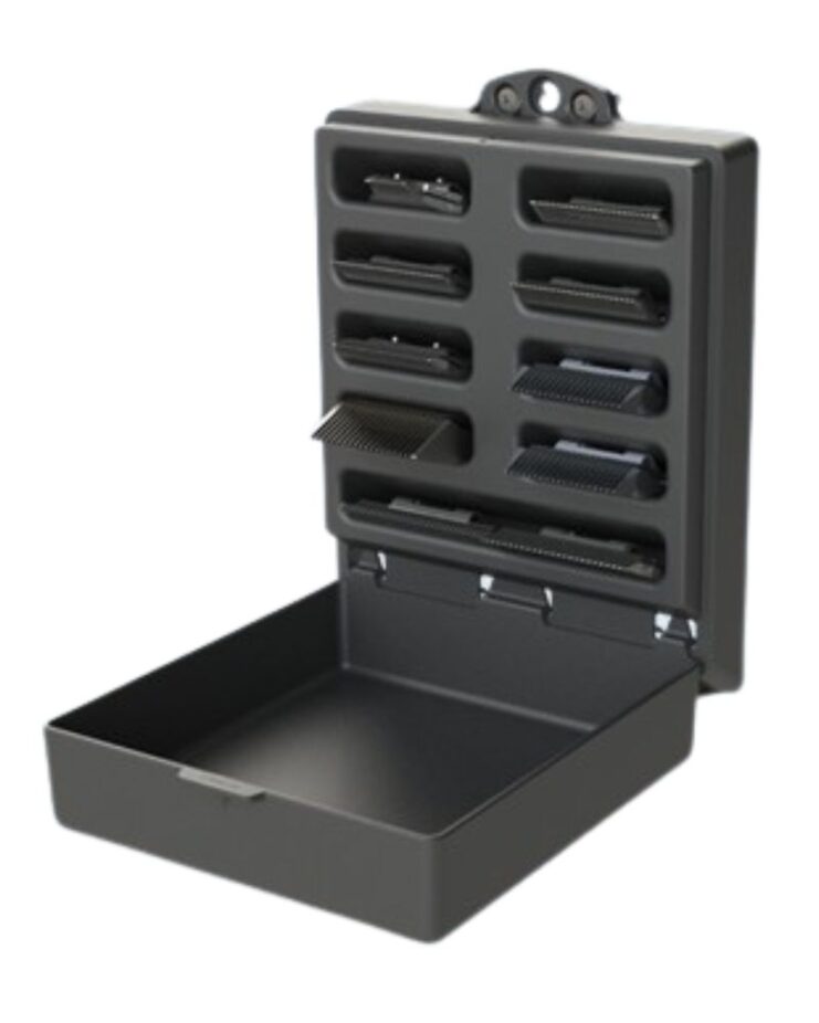 The newly re-designed Double K “The Kaddie” is a blade storage & versatile, solvent-resistant organizer wash tray combo item and is made of very high quality, durable & dense black plastic that can hold up to 10x Blades in their own individual slots for safety & or small tools can be stored in the bottom tray so it has a dual function ability and then the base can also be used for the washing of your blades