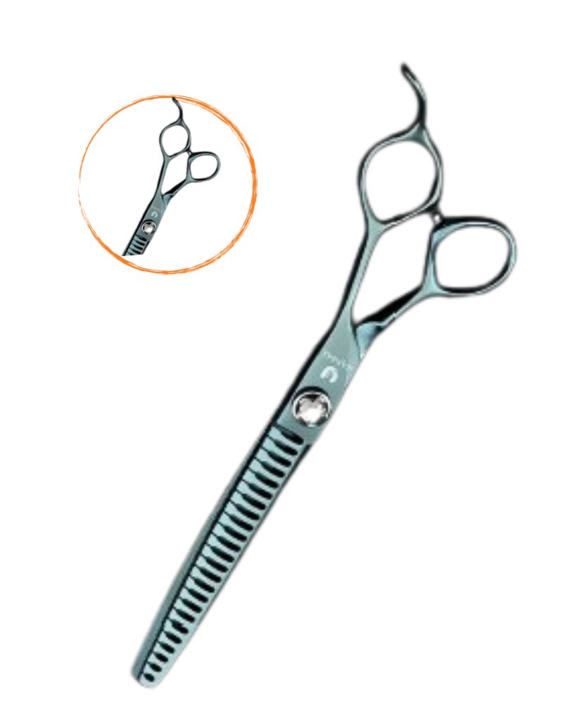 *Sculpture* scissors used to finish/texture a cut the ‘T’ shaped teeth allow hair to be pushed away from the cutting blade, giving a much softer and natural finish and they are great for removing scissor marks and blending different lengths of hair the best use of these scissors are on areas like legs, underlines, ears, and heads to blend and smooth out the coat.
