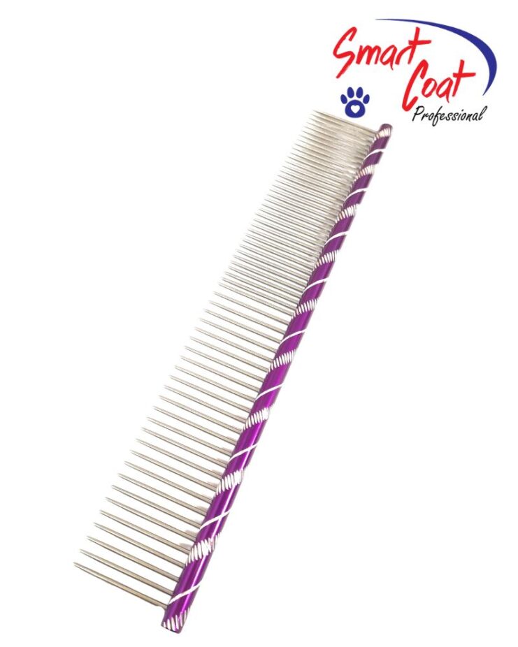 This Smart Coat Purple short pin metal comb with a 50/50 wide to narrow spilt and has the added benefit of being able to follow the contour of the animals body reducing the stress on your wrists & is more durable, it can groom more of the denser, curly or thicker coated animals with the wider comb side with minimal damage to the animals coat as they are an excellent comb for removing any knots or tangles also by combing your animal it also helps promote blood circulation by stimulating the animals skin & aids in distributing the animals natural oils through the coat keeping it healthy & shiny