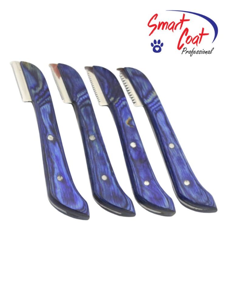 Smart Coat Blue Right-Handed Carding/Stripping Knife 4 Piece Set which includes: 1x Extra Fine of 34 Teeth, 1x Fine of 27 Teeth, Medium of 19 Teeth, 1x Coarse of 14 Teeth