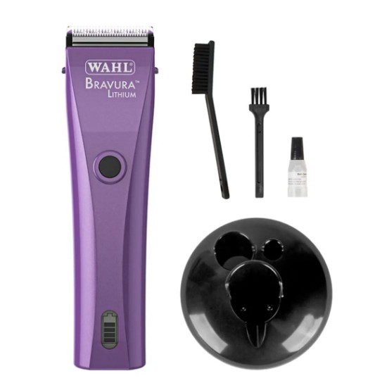 Wahl Bravura Lithium 5 in 1 Corded or Cordless Purple Clipper/Trimmer with a re-chargeable lithium ion non memory battery which prevents over charging or over heating as it only consumes the energy it needs to charge & the technology for optimal performance for the professional groomer or the domestic dog owner with its super quiet rotary powerful motor with ‘torque sensing’ ability for differing hair types of up to 5500 spms giving you approximately 90 minutes cordless run time & when this clipper/trimmer is fully charged in approx. 60 minutes & with a handy LED battery charge level indicator for the user